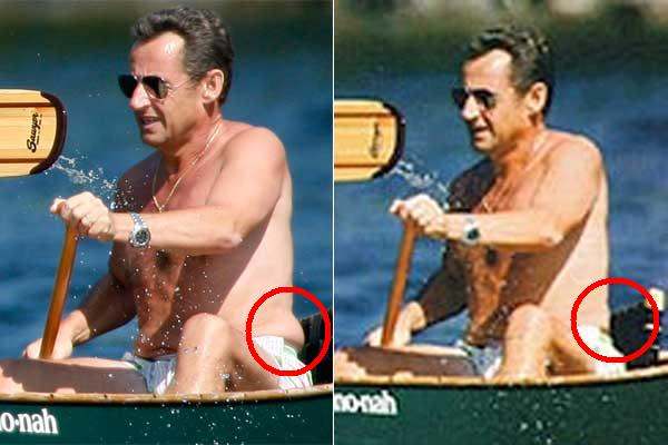 Fa un temps ens vam assabentar que el diari francès Le Figaro va publicar una fotografia de Rachid Dati, ministra de Justícia del govern de Sarkozy, en la què gràcies al Photoshop va poder esborrar del seu dit un anell que tenia un preu de més de 15.000 euros. Però no era la primera vegada que el president de la república francesa es veia beneficiat per aquest famós programa, ja que a l’estiu del 2007 el Paris Match li va fer desaparèixer la seva corba de la felicitat en una imatge en la què se li veia fent esport durant les vacances. Amb amics així a la premsa començo a dubtar que Carla Bruni, la seva dona, sigui tan guapa com sembla.