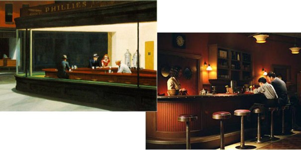Però segurament el pintor més cinematogràfic de tots és l’americà Edward Hopper. A la seva obra podem reconèixer tota una iconografia d’uns Estats Units retratats una i altra vegada per cineastes com Martin Scorsese, Tom Di Cillo, Wim Wenders o el propi Alfred Hitchcock. És un pintor de silencis, de soledats urbanes, de ciutats nues, de capvespres, de carreteres amb benzineres com a únic signe de vida… I és, he de dir-ho, el meu pintor favorit. Segurament la seva obra més coneguda és “Nighthawks”. Es tracta d’una pintura d’una profunda bellesa. Tots hem vist alguna vegada una barra de bar semblant. La ciutat dorm mentre aquests “falcons nocturns” esgoten els darrers minuts i les darreres copes abans de que el bar tanqui. Potser hi ha un televisor encès que ningú fa cas, o un borratxo parlant sol, o un cambrer que dóna conversa a una jove solitària, o un anunci de neó que dota d’intermitències l’escena. És Hopper en la seva màxima essència i resulta visible en la pel·lícula “Camí a la perdició” (2002) de Sam Mendes.