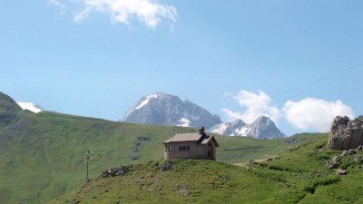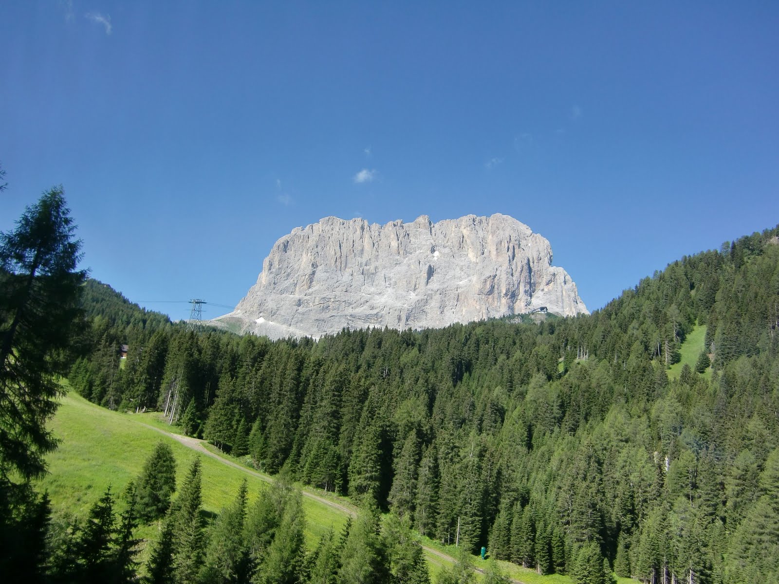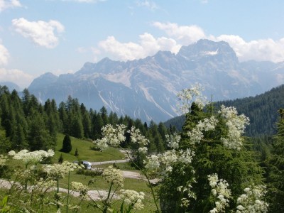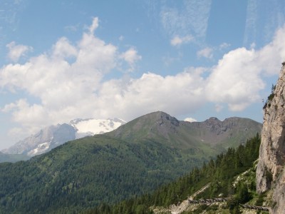 i també des d’aquest coll podem albirar per primer cop el cim més alt de la regió, la Marmolada, la reina dels Dolomites, amb els seus 3342 m.