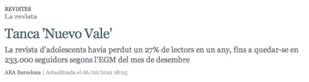 Realment és molt trist perdre una publicació amb tanta història. Ara què faran les adolescents? Es passaran al “Qué leer”? I si volen saber què fa el Justin Bieber, s’hauran d’esperar que surti a les pàgines dels diaris d’adults quan es declari addicte a alguna cosa o quan apareguin “biebés” fruits d’una nit esbojarrada en un hotel de Las Vegas? No m’agradaria ser adolescent del segle XXI sense el Nuevo Vale. ¡Ya les vale!