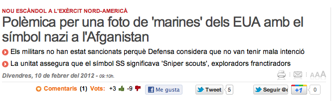 El cos dels marines dels EUA s’enfronta a una nova polèmica després que hagi circulat a internet una fotografia en què un grup dels seus soldats posa davant d’una bandera nazi de les SS a l’Afganistan. El cos d’infanteria de marines ha assegurat en un comunicat que l’ús d’aquest símbol és inacceptable, però ha afirmat que els soldats que apareixen a la foto, que es va fer el setembre del 2010, no seran sancionats.