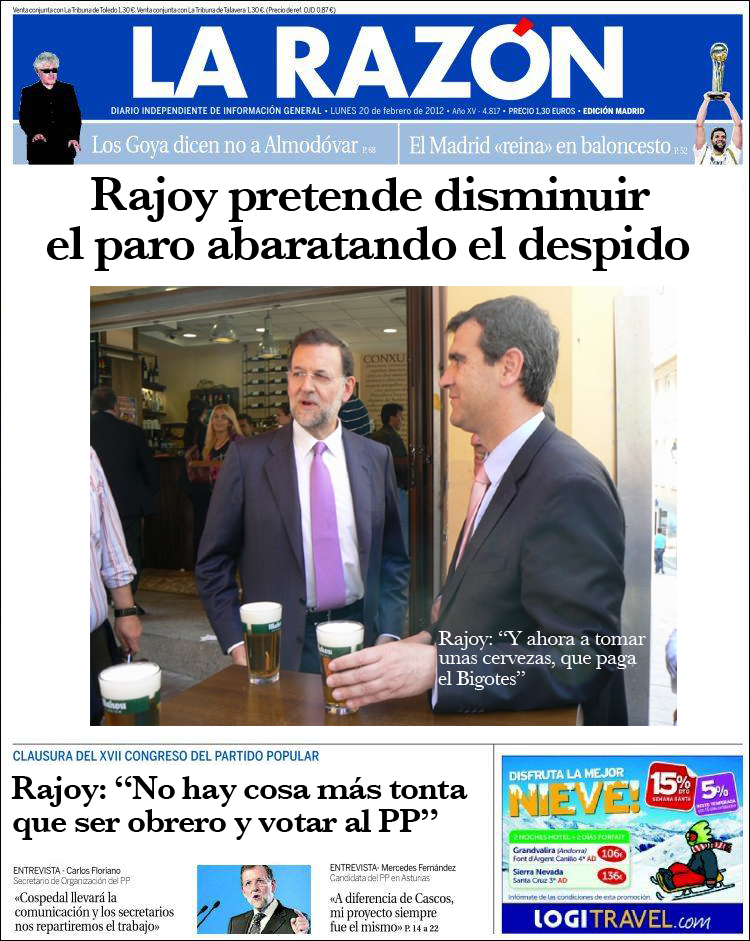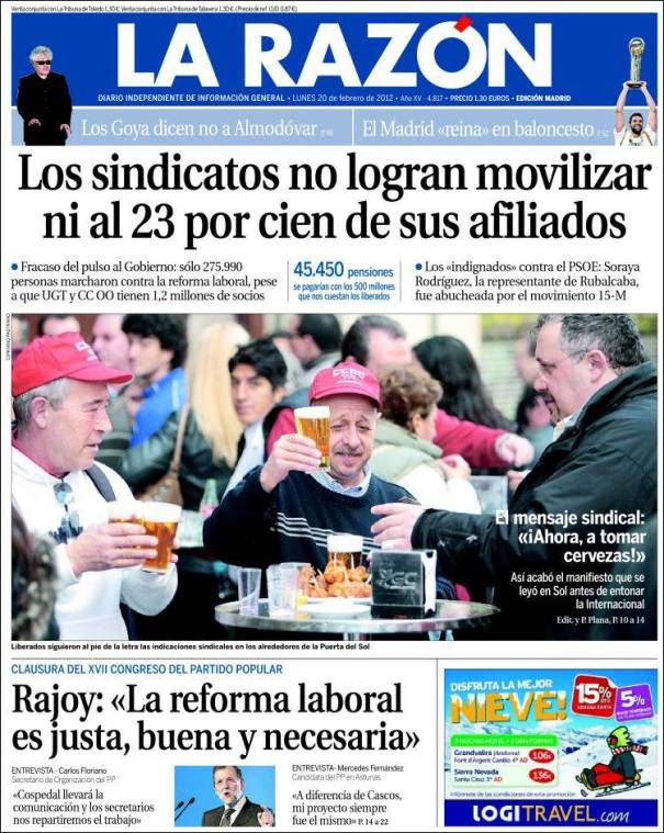 Molt divertida la portada de La Razón d’avui. De totes les mobilitzacions que hi van haver a Espanya, del més d’un milió de persones que es van manifestar en contra de la reforma laboral, de tots els missatges que vam mostrar rebuig a la política del govern, es queden amb una foto d’uns manifestants prenent unes cerveses. És com si per documentar l’augment del vigor sexual de la tercera edat busquessin una foto de Luís María Ansón experimentant una erecció als concursos de Miss Espanya en el que és tan habitual.