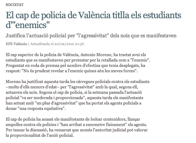 Com sou els polis! S’ha de ser molt valent per agredir a estudiants de secundària i a ancians que passen pel carrer. Ah, que no és cert? Deixa de treure brillantor a la teva porra i dóna un volt pels vídeos i fotografies que hi ha a la xarxa. Per les imatges que hem pogut veure es tractava d’una manifestació hiperviolenta (ah, que a Canal 9 no s’ha vist res? Quina sorpresa!). Es possible que a algun policia se li caigués una lentilla i tot.