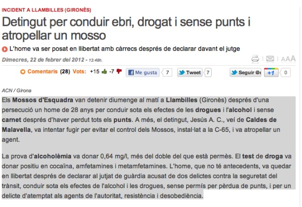 Molt bé la notícia però… per què els periodistes no donen tota la informació? Ha faltat dir que el cotxe era robat, que el paio treballava a les ordres de l’Urdangarín, que va acceptar obsequis de El Bigotes, que se li va veure donant cops de porra a València, que els diumenges treballa d’àrbitre i ja ha xiulat cinc penals a favor del Madrid que no eren, que per les nits veu Intereconomía i que, a sobre, va dissenyar el logotip de Madrid 2020. I el més important, que com és la primera vegada que ho fa i és el cunyat del subsecretari del departament de la subsecretaria de l’amic que escull els vestits del polític que acaba de guanyar un escó, quedarà en llibertat amb càrrecs i que, quan la gent s’oblidi del cas, els càrrecs ja s’arxivaran. És que s’ha de dir tot!