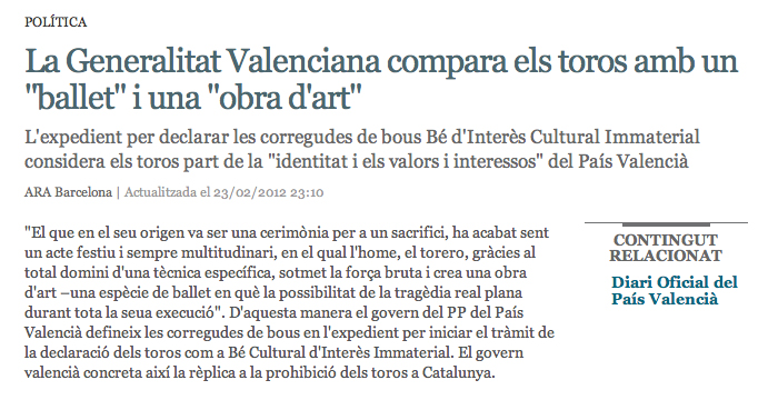 Després de llegir aquesta notícia he arribat a una conclusió: el govern del PP del País Valencià mai ha vist un espectacle de dansa. Que els paquets dels ballarins tinguin la mateixa forma que els paquets dels toreros no significa que siguin dos espectacles iguals. Per començar, en cap muntatge d’aquest meravellós art que és la dansa, mai he vist que es maltracti a cap ballarí, ni se’l torturi. A l’espectador a vegades potser sí, però mai als ballarins.