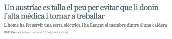 “Un home austríac s’ha amputat un peu amb una serra elèctrica per no haver d’acudir a la revisió mèdica que havia de determinar si havia de tornar o no al seu lloc de treball, segons ha informat avui l’emissora pública ORF.
