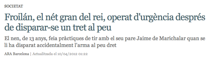 Les armes les carrega el diable i en mans dels Borbons hi ha més perill que un mandril amb una metralleta. L’afició dels monarques i descendents per la caça és coneguda, la caça de pobres bestioles inofensives és un substitut de la guerra. L’avi d’aquest noi és conegut per les seves aficions a la caça, recordeu el cas d’aquella notícia de Joan Carles caçant un òs rus borratxo, tot i que molts anys abans, quan encara no era rei i manava a les Espanyes un altre gran aficionat a la caça i a tenir avingudes a tot arreu, va disparar accidentalment al seu propi germà. Desitjar-li a Froilan una ràpida recuperació i que deixi les armes en pau, que encara prendrem mal.