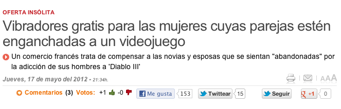 “La adicción a los videojuegos no es solo cosa de niños. Prueba de ello es que un comercio francés regala vibradores a todas aquellas mujeres que se sientan “abandonadas” por la actividad compulsiva de sus parejas con Diablo III, un videojuego de rol de acción de Blizzard Entertainment.