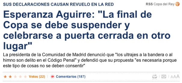 Te escribo para solidarizarme con tu propuesta de que la final de la Copa del Rey se juegue a puerta cerrada. Tienes razón. No es bueno mezclar el fútbol con la política. Por este motivo, creo que también sería buena idea celebrar a puerta cerrada la manifestación ultraderechista que habéis autorizado sólo unas horas antes de que se juegue la final. Es más, como el Santiago Bernabéu está impracticable con tantos inodoros y albañiles campando a su anchas… que vete a saber tú qué encontrarán (quizá por fin aparecerá el balón del penalti de Sergio Ramos), te propongo un buen lugar. Concretamente había pensado en la plaza de las Ventas. Tú sabes que a esa gente del bigotillo y llaveros de la Falange les pone mucho eso tan español de los toros. ¿Qué te parece si les soltamos a cinco Miuras de 500 Kg? Eh, pero con ellos en la arena para que los vean de cerca. O mejor aún. Soltamos a cinco elefantes y así seguramente al rey le apetecerá ir.