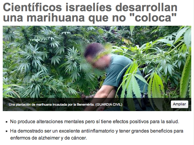 “Científicos israelíes han desarrollado un tipo de marihuana que no contiene THC (Tetrahydrocannabinol), el componente psicoactivo de la planta y que provoca lo que se conoce popularmente como ‘colocón’.