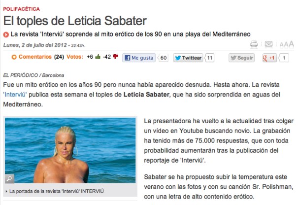 S’han esgotat ja els Interviús? Han hagut cues als quioscos? Ha semblat la sortida d’un nou iPhone? Ei, que és “el mite eròtic dels 90” segons assegura el becari que signa aquesta informació. Leticia Sabater, con “mucha marcha”. Una noia incapaç de distingir la polisèmia dels sinònims i que va desconstruir el que els nens del 90 aprenien a l’escola. Una periodista (?) que muntava baralles als platós amb actors tan dolents que, quan es fotien de mastegots, tenien greus problemes per evitar riure. La que enregistra un vídeo i el penja a YouTube, suposadament per buscar parella. Una cantant (?) capaç d’interpretar temes que haurien de merèixer l’atenció de l’Audiència Nacional per apologia del terrorisme… intel·lectual (Soy tu colegui Leti y te voy a enseñar una nueva forma de bailar el Leti Rap. Podrás vacilar y te podrás quedar con todos los coleguis de tu misma edad. Ponte una gorra para empezar, y cálzate unas Alpe guay guay de verdad. Tronquis y coleguis vamos a rapear esta super marcha que te va a molar). Una compositora (?) que reivindica ser la coautora d’una cançó anomenada Polos opuestos i que té una lleugera semblança amb Opposites atract de Paula Abdul: