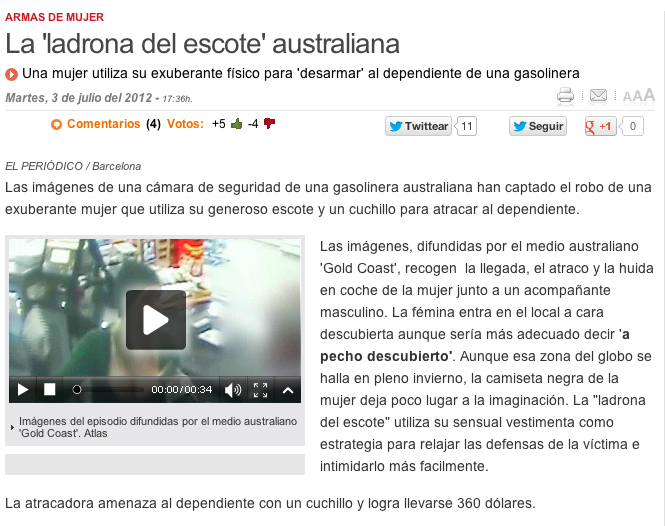 Han arribat les rebaixes a alguns mitjans de comunicació com El Periódico i amb elles, aquella màxima que assegura que no has de deixar que la realitat t’espatlli una bona notícia. Observem la redacció de la informació: “las imágenes de una cámara de seguridad de una gasolinera australiana han captado el robo de una exuberante mujer que utiliza su generoso escote y un cuchillo para atracar al dependiente”. Deixant de banda l’us dels adjectius (exuberante mujer y generoso escote) dóna la impressió que la principal arma de coacció són els pits. Segons el redactor, la notícia rau en el pitram de la dona. Després diu que “la fémina entra en el local a cara descubierta aunque sería más adecuado decir a pecho descubierto”. Tanmateix, abans ha assegurat que portava un ganivet. És a dir, el redactor (o redactora) insinua que els homes quan veiem un parell de pits experimentem una mena de reacció que ens paralitza. No m’imagino què deu sentir el caixer del supermercat d’un càmping nudista. Allà no deu pagar ningú!