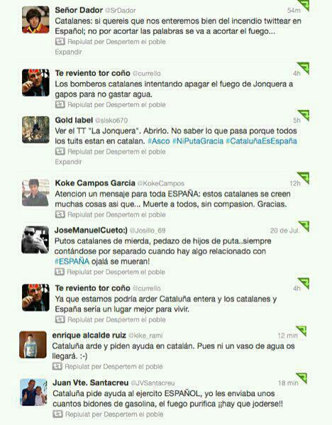 “Capítulo segundo. Derechos y libertades. Artículo 14:Los españoles son iguales ante la ley, sin que pueda prevalecer discriminación alguna por razón de nacimiento, raza, sexo, religión, opinión o cualquier otra condición o circunstancia personal o social.” Això és el què diu la constitució dels espanyols. I ho dic així perquè la llei és igual per a tots els espanyols, no per als catalans ni aquells que no sent-ho, viuen a Catalunya plenament integrats. D’OVNI’s potser n’haureu vist volar, però d’empresonament d’aquells que han cremat senyeres catalanes, no ho crec. El discurs del nostre reietó borbó amb motiu del cas Urdangarin: “La Justicia ha de ser igual para todos”. Qui són aquests todos, em pregunto ?? Vosaltres ho sabeu ??. Discurs del rei d’ara fa anys amb el qual es va ben lluir (com sempre): El idioma español ha sido lengua de integración y nunca de separación. També deia en el mateix discurs que “nunca fué impuesto”. Mireu companys, segur que ja ho sabeu, però doneu una ullada als digitals, Directe.cat, E-Noticies, Elsingular i molts d’altres i d’aquests comentaris n’estan farcits CADA DIA. Per tant no hem d’estranyar-nos de res en aquest concepte. D’aquesta brivalla que borda com els gossos, amb perdó d’aquests i ue esgarrapa com les gatoses, no ens en hem d’estranyar de res. D’allò que sí ens en hem de guardar, és d’aquelles accions que no s’escriuen però que sí estan en les actituts d’un 95% dels espanyols. I per últim, d’allò que també ens en hem de guardar, és de l’actitut del nostre govern de Catalunya, que conscient de tot això, no fa res, absolutament res per aturar-ho, tot i tenint ara i avui, la força moral i política per a dir prou.