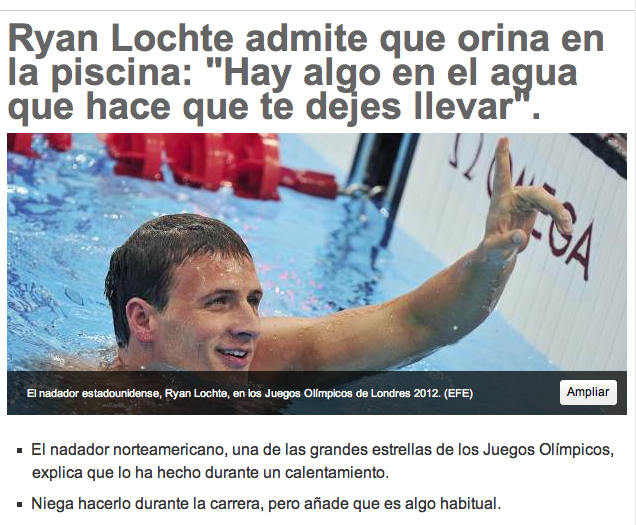 Bé, torno a indignar-me. Ho sento però, com et pots pixar en una piscina olímpica i, a sobre, presumir del teu terrorisme pixaner? Lochte, que tard o d’hora compartiràs piscina amb altres nedadors! No veus que intentaran nedar més ràpid que tu per no empassar-se un glop de la teva estela?