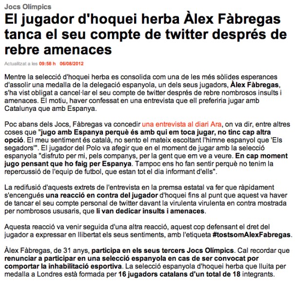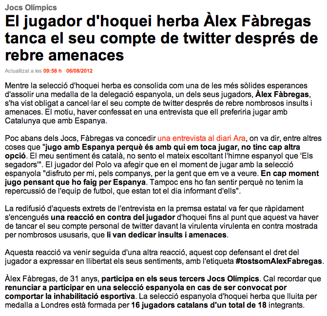 Les amenaces a Fàbregas només són un episodi més, hem vist amenaces i insults semblants arran de l’incendi de l’Alt Empordà, durant l’EuroCopa, durant els dies previs a la final de la Copa del Rei, etc.