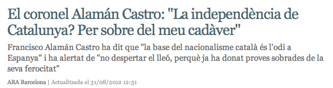 Para los que estudiamos un poco de historia resulta una experiencia igual de traumática el hecho de escuchar a un coronel opinando sobre cuestiones políticas. Ya se sabe cómo arregláis vosotros las cosas cuando se os hinchan los cetmes. Que si un golpe de estado, que si otro golpe de estado… originales, lo que se dice originales no lo sois mucho. Sí, es cierto, tenéis las armas. Pero yo te pediría que reflexionases un poco acerca de esa jubilación forzosa que te quieres aplicar. Porque, cuando dices que la independencia de Catalunya se producirá sobre tu cadáver, ¿estás realizando una promesa? Me explico, ¿tanto nos quieres a los catalanes que serías capaz de sacrificar tu vida con tal de no ver que Catalunya se transforma en un estado reconocido por la comunidad internacional? Házmelo saber porque soy capaz de pagarle los carnets del Barça a tu descendencia. Es lo mínimo que puedo hacer como contribución a tu mesiánica causa.