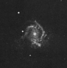 Fotografia de l’M61. En aquesta imatge veiem tres estels interposats. En la galàxia pròpiament dita, el punt més brillant el trobem en el centre, per bé que també hi ha altres punts brillants en forma de tres braços. El 10 d’abril del 1828, John Herschel atribuí una morfologia “bicentral” a la nebulosa, en distingir la densitat més lluminosa del braç que apareix aquí en la part inferior. A l’objecte el precedeixen quatre estels telescòpics, i el segueix un altre [17 Virginis]. Es distancia d’aquest darrer estel, en direcció SW, en 1º. Aquest objecte es troba en la perifèria d’una massa vasta de nebuloses diferenciades però properes, les formes esfèriques de la qual són indicatives de compressió.