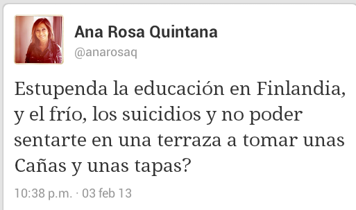 Nota: ante la enorme cantidad de lecturas que ha tenido este “post”, me gustaría aclarar que el catálogo de faltas de ortografía que habéis podido leer y que espero que no os haya causado problemas en la visión, constituye un pequeño ejercicio de ironía. Precisamente, la ironía es el último de los reductos que nos queda a aquellos que, día sí, día también,contemplamos cómo en este país se degradan valores como el esfuerzo, el amor a la cultura o la educación. La ironía, el humor y la distancia que adoptemos ante determinados personajes seguirán siendo buenas medicinas para que la realidad no nos muerda demasiado. Por cierto, después de ver el programa “Salvados”, en el que se analizaba el modelo educativo finlandés, no puedo sino mostrar mi afecto por ese país. He tenido alumnos finlandeses y sé perfectamente cómo valoran determinados aspectos que aquí parecen realmente utópicos.