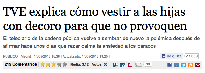 El que em pregunto és quan arribarà el burka hispà (ah, que aquesta funció ja la fan la peineta i la mantilla?). Vinga, ben tapadetes perquè cap mascle ibèric se senti atacat per pensaments impurs. Si és que som tots tan i tan homes, tenim tanta i tanta testosterona en el nostre cos, que fins i tot la Heidi ens provoca la libido. Sort que tenim a TVE perquè ens doni consells. Per aquest motiu llençaré a la brossa totes les samarretes de la Hello Kitty (una gateta massa sexy), i les de la Daisy (massa feminista), i les de Minnie (massa intel·ligent) i les de les Barbie (per motius obvis). Encetem una creuada contra tot allò que desvia a les nostres nenes del camí de la virtut. El model ha de ser Soraya Sáenz de Santamaría! Si totes les nenes se semblessin a ella, els homes troglodites que habitem la geografia d’aquest país ja no ens hauríem de preocupar de cap pensament luxuriós. Vinga, me’n vaig a resar i després una dutxa d’aigua freda. Acabo de planxar la samarreta d’una Monster High i… uf!!!