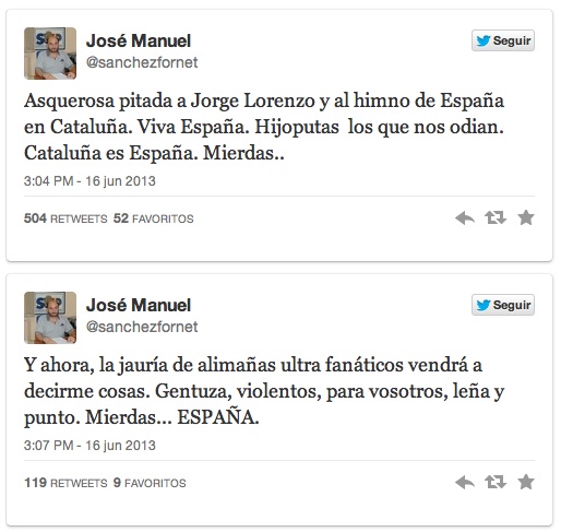 Y es que tienes un excedente de odio que sólo me lleva a pensar que en el patio te robaban los bocadillos. Supéralo, José Manuel. Quizá solo, no puedas. Seguramente necesites ayuda de un especialista. Alguien que te lleve a pensar que, insultando a alguien (en tu caso a millones), es imposible que sienta el más mínimo afecto por aquello que defiendes. Al fin y al cabo, lo que tú llamas “jauría de ultra fanáticos, gentuza, violentos y mierdas” son personas que unieron sus labios y cometieron algo tan atroz como silbar. No me imagino cómo hubiese cambiado la Historia si Felipe V, José Antonio Primo de Rivera o Franco, por citar a alguno de tus ídolos, hubiesen silbado en vez de haber jugado a ser tan… ¿patriotas?