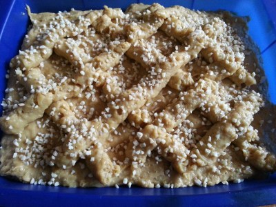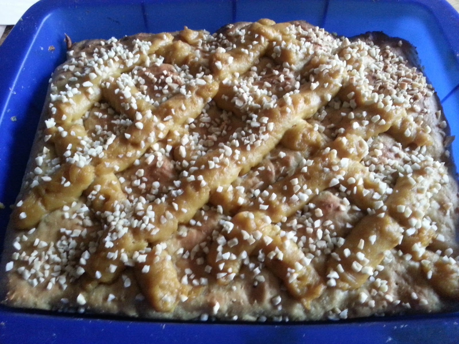 Afegir la crema de pastisseria, les ametlles en granet i posar al forn. Això depen. Jo he posat 20 min a 150º C en foc a dalt i a baix. i 5 min a 180º C.
