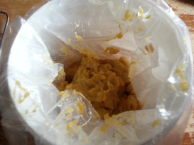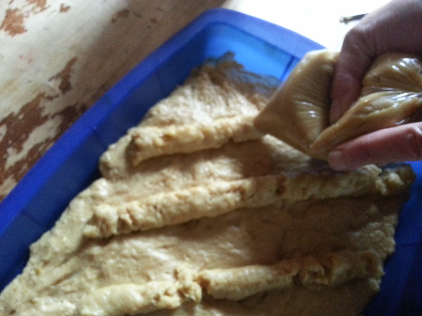 Per fer la crema barrejar tots els ingredients i cuinar fins que espesa. Posar en una bossa de plàstic i deixar refredar i 1 hora a la nevera.