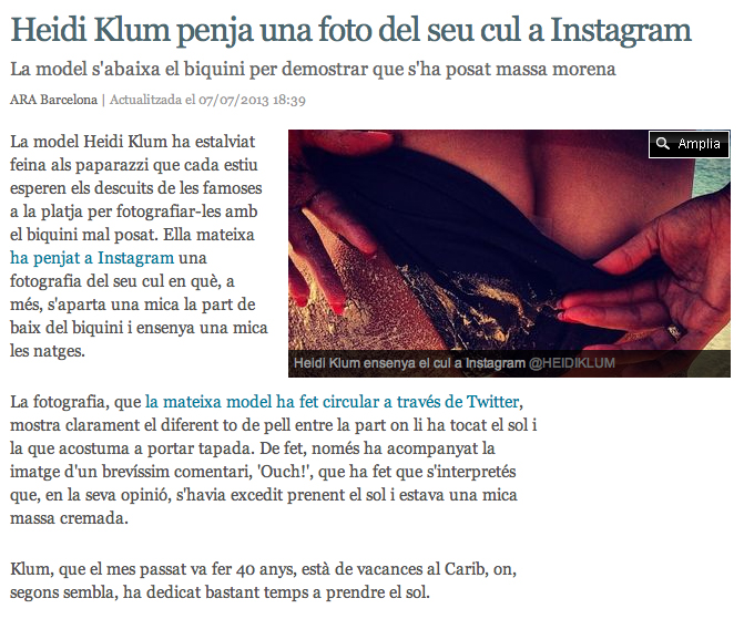 Però anem al que ens interessa: el Klum de la Heidi Cul… o era al revés? Si aquesta noia ha decidit retratar les seves natges és per l’intent de que les fotos estiuenques entrin en deflació. Un cop globalitzat el seu cul, les imatges perden valor en el mercat dels paparazzi. És com la paella. El primer dia pot estar bona, però menjar paella cada dia pot ser un turment.