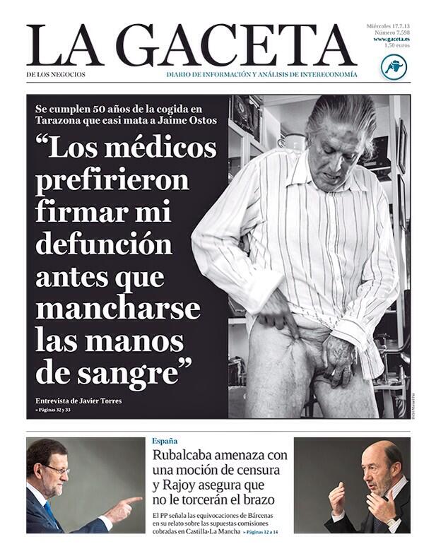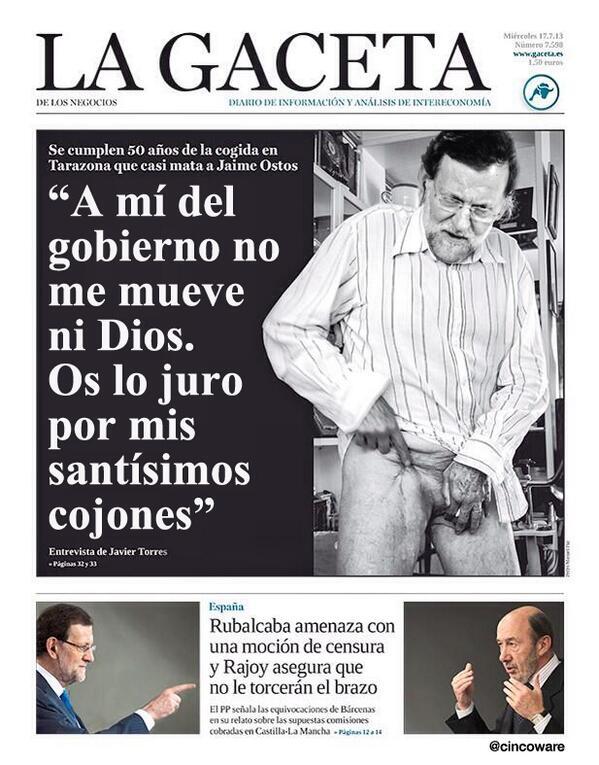 Redactor: Yo pondría la foto en grande y arriba. Debajo, en la izquierda, a Rajoy. He buscado una foto señalando con el dedo… que parece que diga: mira, rojillo, por los cojones del torero que no podrás conmigo. En la derecha, ponemos a Rubalcaba. Mira… más o menos… así.