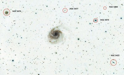 Astrofotografia que ens mostra l’M101, en el centre, i diverses galàxies que es troben en el mateix camp. De les galàxies assenyalades, l’NGC 5474, l’NGC 5477 i l’NGC 5473 són galàxies satèl•lits de l’M101. L’NGC 5422 i l’NGC 5484 són galàxies espirals molt més allunyades, no vinculades al Grup de l’M101.