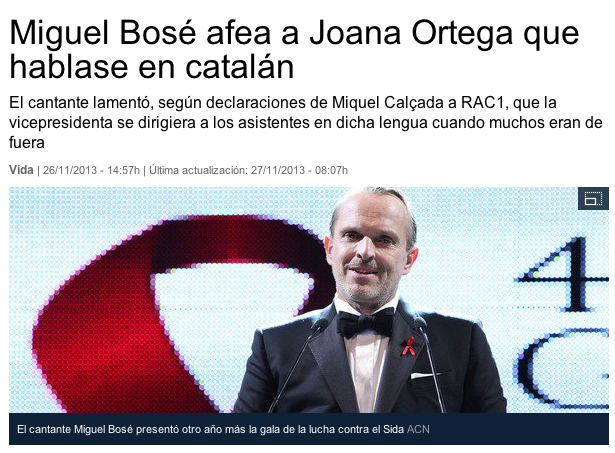 Imagina’t la següent situació: tu, Miguel Bosé, decideixes que has d’anar a un congrés de música avançada (bé… potser en el teu cas és un exercici d’imaginació complicat). En tot cas, aquest congrés se celebra a Boston, Massachusetts. Allà hi ha un ponent que vol parlar en la seva llengua materna… no ho sé… l’anglès. I, a més a més, aquest ponent ho fa en la llengua oficial que és, suposo, l’anglès. Ara imagina’t que un senyor de Quintanilla de Onésimo decideix que això de la música avançada li agrada molt i es compra un bitllet per anar a Boston, Massachusetts. Aquest senyor tindrà el dret a menjar-te l’orella dient que el ponent és un maleducat perquè parla en anglés, podent parlar en castellà que així l’entén? Ah, és clar! No és el mateix! Des de 1714 hem d’abaixar el cap perquè, com hem estat conquerits… com el castellà l’entén tothom… com som a Espanya… com el català no serveix per a res… com som una colònia…