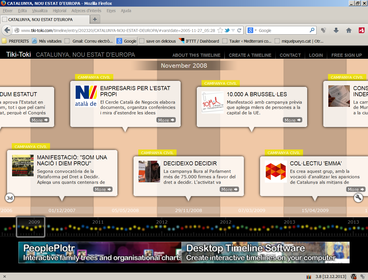 Joan Carreras, Janquim, escriptor i periodista, presento amb un apunt en el seu blog un projecte digital personal que pretén oferir una cronologia del moment històric que està vivint Catalunya. Els esdeveniments, fets, decisions, campanyes, notícies, editorials… que s’hi relacionen hi estan relacionats minuciosament, a través de Tiki-Toki, una eina per elaborar atractius cronogrames interactius i penjar-los a internet. Jo he usat anteriorment una altra eina per confegir cronografies (timestoast), però Tiki-Toki proporciona un resultat més llaminer.