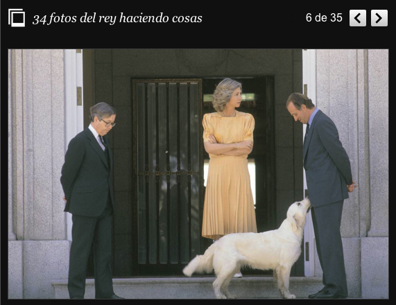 Per cert, a la web de la revista hi ha un espai que amb el nom “34 fotos del rey haciendo cosas” ens mostra un recull d’imatges de la vida del monarca. Tanmateix, hi ha una en la què és al rei a qui li “fan coses”. Això sí, crec que el gos no es diu Marhuenda.