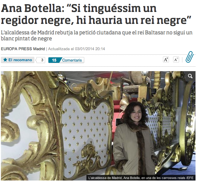 Es veu que a l’Ajuntament de la capital del regne borbònic i constitucional per la gràcia de Déu (que ja és ser graciós) cada rei mag és un regidor d’un grup diferent. I com, de moment, no hi ha cap regidor que se sembli a l’Obama, agafen a un i el pinten. Han de tenir cura, això sí, que el rei no li doni cap petó a un nen per la possible transferència d’ADN, perdó, de maquillatge (amb la llei Gallardón ja no sé en què estic pensant).
