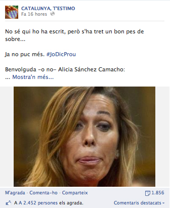 Ahir em va passar un fet estrany. Estava navegant pel Twitter i vaig veure que una carta que li havia escrit a l’Alícia Sánchez-Camacho el passat 24 de gener estava compartint-se a dojo. I no només això, sinó que un videoblocaire havia fet un vídeo a partir d’ella. També em vaig assabentar que s’estava compartint a Facebook i a WhatsApp. Tanmateix, amics, la fama és injusta. Ningú sap qui ha escrit aquesta carta. He pogut llegir comentaris com: “realment flipant, brutal, descomunal, m’encanta, visca la mare que et va portar al món, gràcies per escriure el que tots pensem i pel que sigui, no fem”. Un altre exemple: “no sé qui ets, però sé que ets. Felicitats per escriure tan clarament i tan educadament el sentir de la majoria dels catalans”. I més: “molt fan del que ha publicat el text , no es pot expressar millor els nostres sentiments. Aquest és el que més m’agrada: “en aquests casos s’hauria de poder substituir el “Me gusta” per un “Me encanta”, “Me chifla”, “Así se habla”, “Ole tus huevos/ovarios” o visca la mare que et va parir. Es pot dir més alt però no més clar. No hi hauria forma de fer-li arribar aquest escrit a la destinatària de la carta? I que hi hagués alguna càmera que ho filmés a veure quina cara se li queda a la S.Camacho????”
