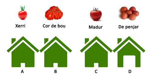 Imagineu que teniu 4 veïns i que sabeu perfectament quin tipus de tomàquet consumeix cadascun. Per tant, tens dues informacions que, ja els agradaria a molts tenir-la: que el pa amb tomàquet es fa amb tomàquet de penjar i que el veí A té xerri, el B té cor de bou, el C madur i el D de penjar. Surts de casa a la cerca del tomàquet: