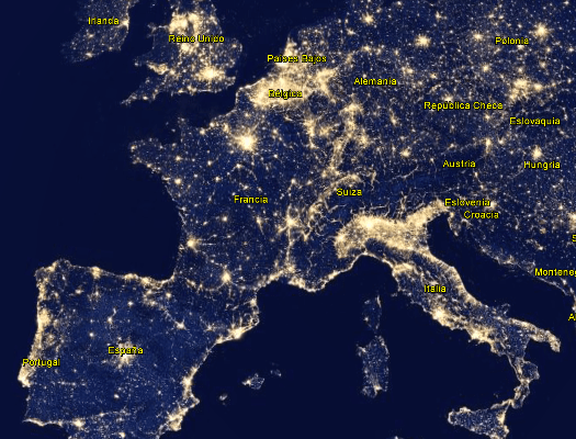 D’altra banda, us sona Eurosunbelt? Mireu, existeixen les anomenades Megaregions. Són regions on hi ha un gran volum de PIB. Una manera d’apreciar aquestes regions, és a través d’un mapa de contaminació lumínica (on hi ha més llum, més industria i és on hi ha més PIB). Es pot veure en la següent imatge de la NASA del 2012.