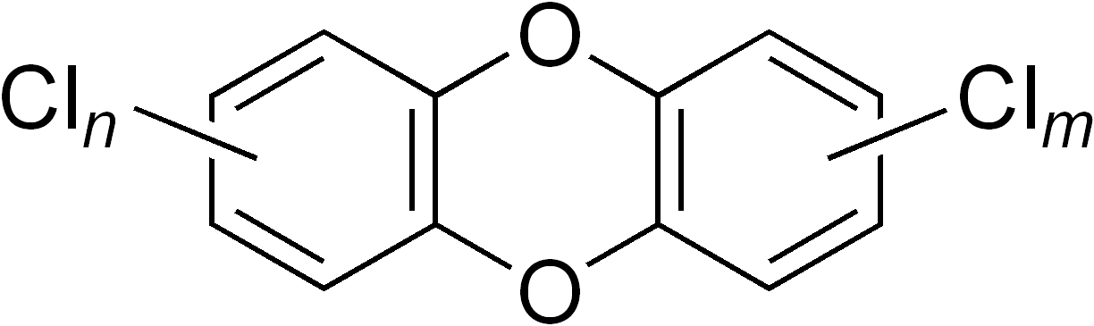 Estructura general de les dibenzodioxines policlorades (PCDDs), conegudes com a dioxines. Processos naturals com incendis forestals i l’activitat volcànica generen dioxines, però en quantitats ridícules respecte els processos industrials. La introducció del procés de Leblanc per a la producció de carbonat sòdic, a partir del 1848, fou una font important de dioxines. A més, a partir del 1872, començà una producció industrial intencionada de dioxines, algunes d’elles amb aplicacions com a herbicides (el cas de l’agent taronja, 2,3,7,8-tetraclorodibenzodioxina, TCDD). Les dioxines són un dels exemples de xenobiòtics (“substàncies alienes a la biosfera”) bioacumulades en el darrer segle com a conseqüència de la industrialització
