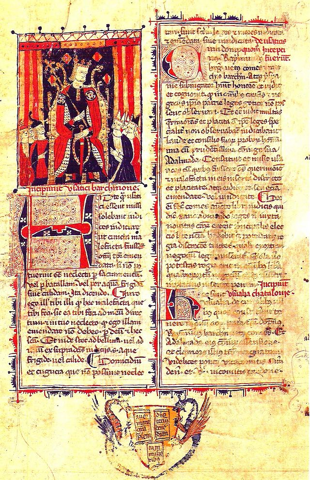 Document medieval dels Usatges de Barcelona (ACA ms. de Ripoll, núm. 38, fol. Documents cabdals de la Història de Catalunya). Hom pot observar al rei Alfons II envoltat de la senyera. La bandera catalana apareix en document medievals i no pas com a “barras de Aragón” terminologia errònia.
