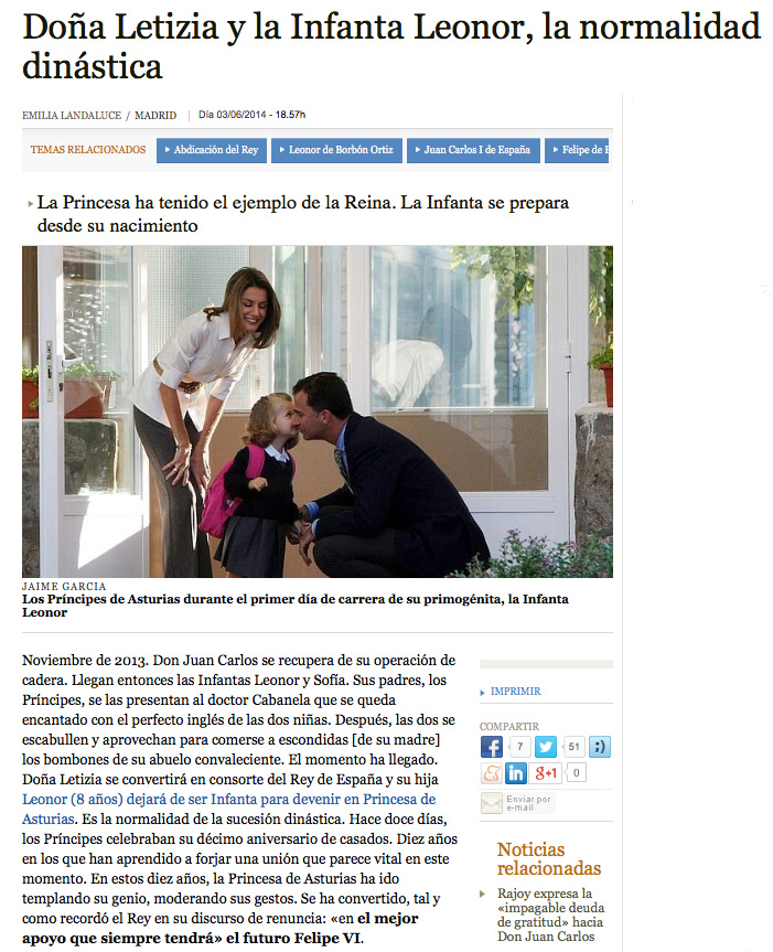 Don Juan Carlos se recupera de su operación de cadera. Llegan entonces las Infantas Leonor y Sofía. Sus padres, los Príncipes, se las presentan al doctor Cabanela que se queda encantado con el perfecto inglés de las dos niñas. Después, las dos se escabullen y aprovechan para comerse a escondidas [de su madre] los bombones de su abuelo convaleciente. El momento ha llegado. Doña Letizia se convertirá en consorte del Rey de España y su hija Leonor (8 años) dejará de ser Infanta para devenir en Princesa de Asturias.