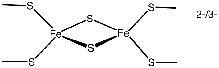 Grups prostètics de proteïnes que contenen ferro. A dalt, estructura química del grup heme b. A sota, tenim un esquema de centre de Fe-S