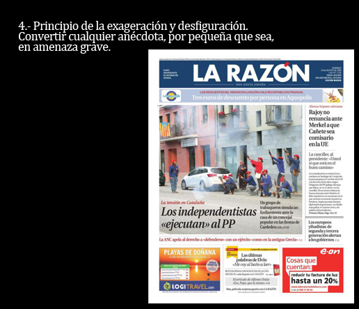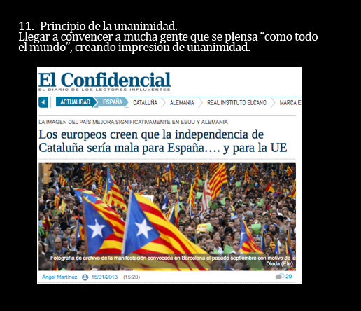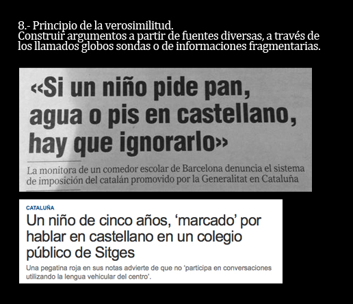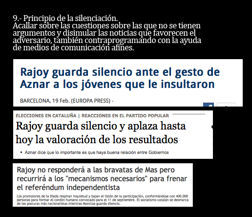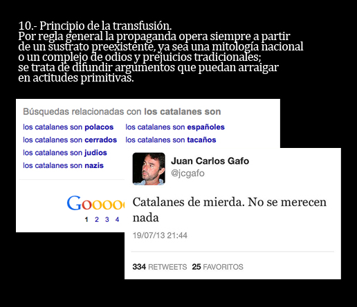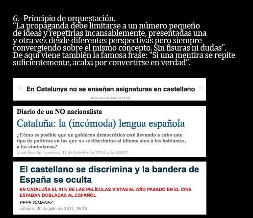 Y sí. Los once puntos que leerás a continuación constituyen los principales ingredientes que imaginó un monstruo llamado Goebbels. A partir de aquí, puedes pensar que la selección de los titulares es demagógica y manipuladora. Tienes todo el derecho del mundo a pensar así. Como yo lo tengo a afirmar que se trata de una muy pequeña selección de todos los titulares con los que los catalanes nos desayunamos cada día y que son una auténtica fábrica de independentistas.