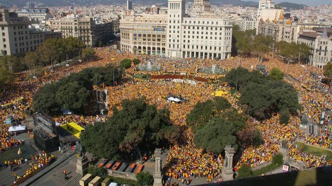Tal com segurament vostès ja sabran, estic molt avesat a plasmar les diferències entre les mobilitzacions de l’unionisme i les de l’independentisme a través d’uns gràfics que acostumen a ser prou eloqüents per si mateixos. Però avui no serà el cas. Avui, com que es dóna la circumstància que la concentració independentista convocada per Ara és l’hora fou en el mateix espai físic —la plaça de Catalunya— que la concentració unionista i anti-consulta convocada per “Societat Civil Catalana” el diumenge passat, penso que és molt més idoni comparar les imatges aèries reals —que jo no treballo pas a La Vanguardia— de cada concentració. Aquí ho tenen: