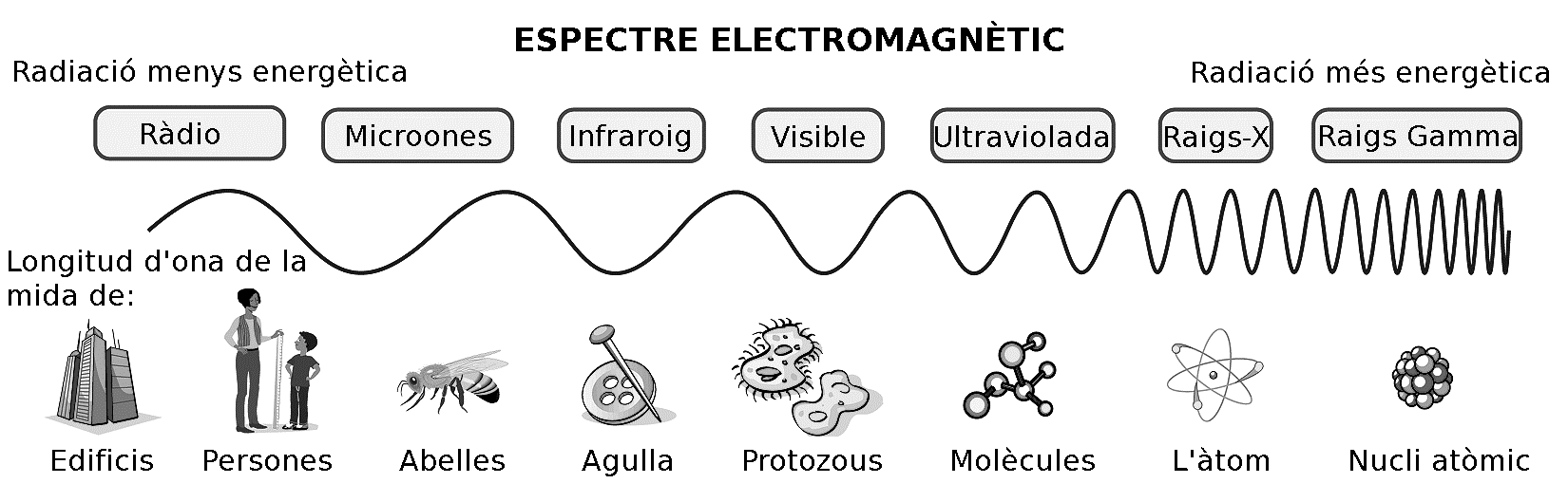 Si bé quan a nivell quotidià parlem de llum ens referim a les radiacions visibles pels nostres ulls (des del violeta al vermell, passant per tots els colors de l’Arc de Sant Martí i la llum blanca que tots ells junts formen), la física defineix com a llum a tot l’espectre electromagnètic, és a dir a tot tipus de radiació, ja sigui visible o no per l’ull humà. D’aquesta manera, la radiació que emet una bombeta és llum, i també ho és la que emet un fluorescent, ara bé llum també és la radiació que surt del comandament a distància però que no veiem (es tracta de radiació infraroja), la que escalfa el menjar al forn microones (radiació de microones) o bé les ones de ràdio o wifi que permeten que ens puguem connectar a Internet amb el mòbil o l’ordinador portàtil. Tota radiació és llum! I el que diferencia tots aquests tipus de llum és la longitud de les ones que la componen. Aquesta diferència fa que la llum sigui més o menys energètica i, per tant, que l’aplicació que li donem sigui tan diferent. Des d’escalfar menjar a il·luminar les nostres cases o fer radiografies dels nostres ossos.
