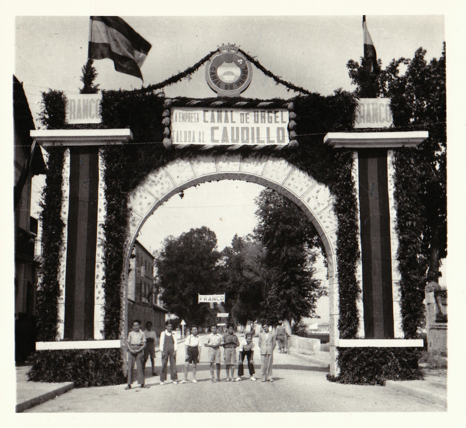Arc efímer, eregit en homenatge al dictador Franco. Concretament el de la societat canal de Urgel al peu del carrer Ferrer i Busquets. A la vista esquerra de l’autor hi ha l’edifici que avui correspon a l’ACUDAM i més endavant l’edifici de la “Casa Canal”