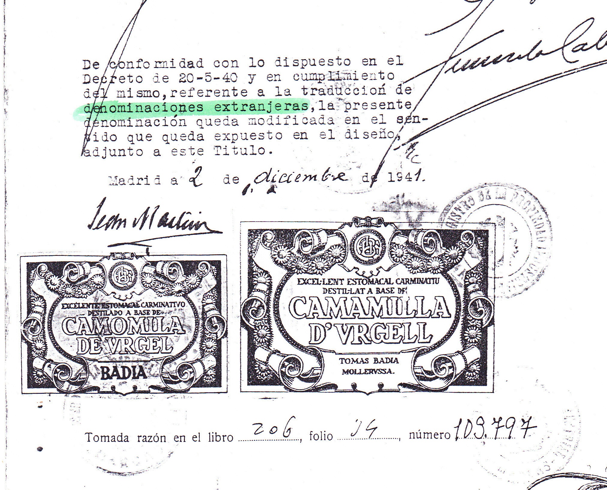 Un exemple de prohibició a Mollerussa el tenim amb la empresa “Badia” elaboradora de vins, vinagres, aiguardents, begudes etc. Aquesta empresa tenia una beguda que duia per nom: “ Camamilla d’Urgell” i a l’etiqueta l’acompanya l’eslògan: “Excel·lent estomacal carminatiu destil·lat a base de…” Aquest nom havia estat registrat així abans de la guerra civil, però durant la dictadura i la prohibició del català, l’empresa Badia va rebre un comunicat del Registre de la Propietat industrial, del 2 de desembre de 1941, en què dia que no es podia etiquetar en català, ni tan sols la denominació, sinó que s’havia de traduir al castellà, concretament deia “a la traducción de denominaciones extranjeras” i a partir d’aleshores es va haver d’etiquetar de la següent forma: “Excelente estomacal carminativo destilado a base de Camomila de Urgel. Badia.” És curiós que el franquisme a part de prohibir el català el menyspreava, ja que fa servir el terme “denominaciones extranjeras.[8]”
