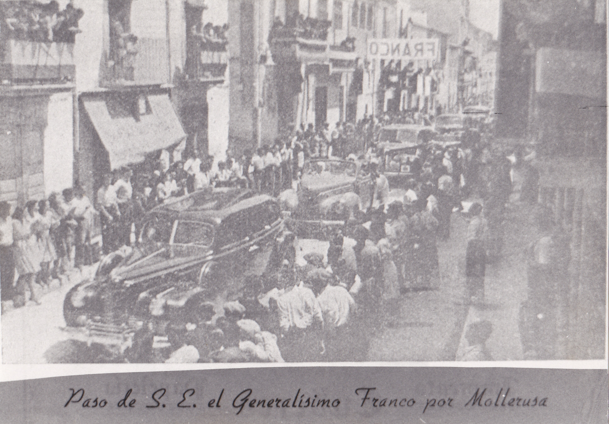 Franco va ser rebut per les autoritats provincials i locals a límits de la província, va passar, per exemple, per municipis com Borges Blanques o Juneda, on se li havia erigit arcades triomfals amb inscripcions de benvinguda[2]. Mollerussa no va una excepció i el 30 de gener de 1942, mentre el dictador realitzava la seva primera visita oficial a la ciutat de Lleida i per aquest motiu la Jefatura Local del Movimiento de Mollerussa convocava els mollerussencs a què es sumessin a l’acte – per dir-ho d’una manera amable- i comença d’aquesta manera: