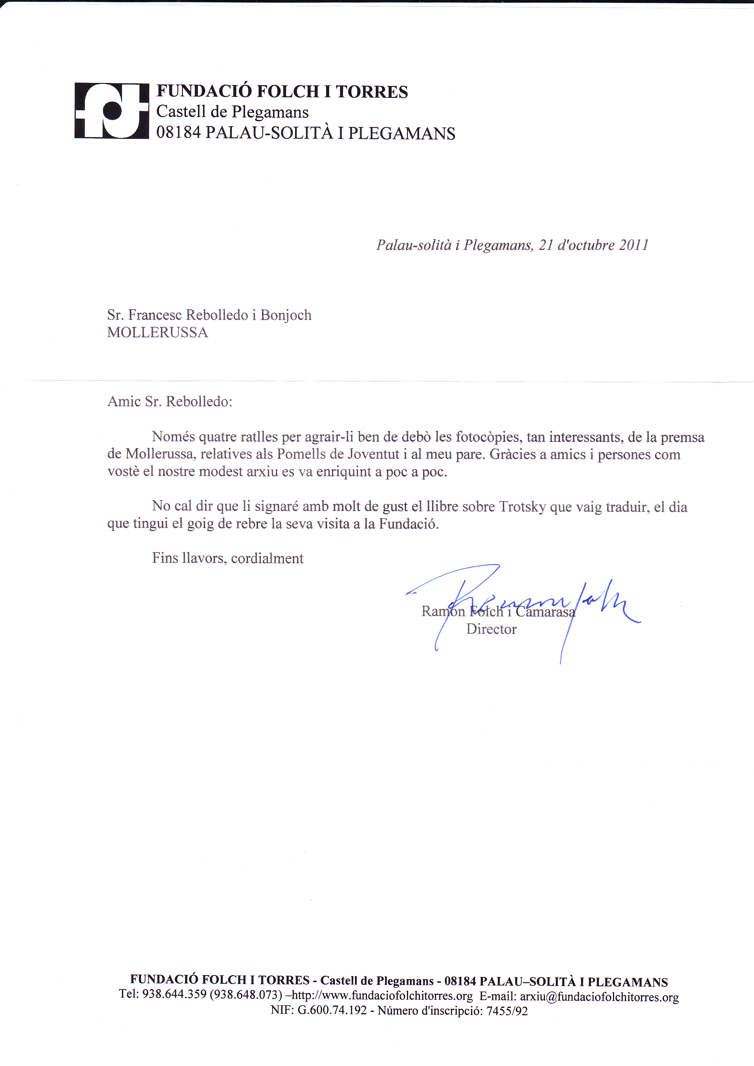 Carta del sr. Ramon Folch i Camarasa agraïnt-me la col·laboració que li vaig proporcionar