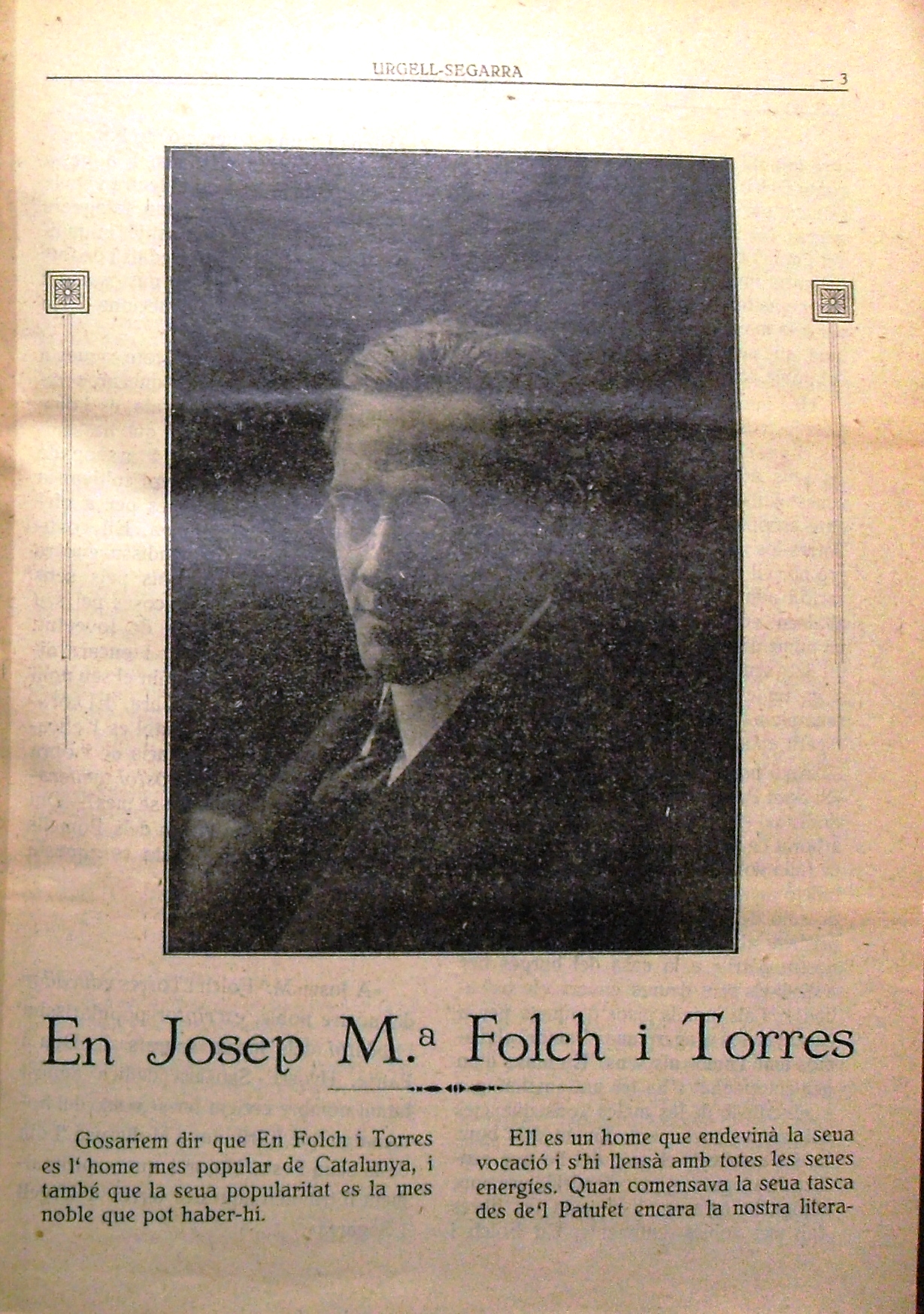 Article dedicat a la tasca de J. M. Folch i Torres a la revista Urgell-Segarra. 4 de juny de 1922. Fotografia Francesc Rebolledo