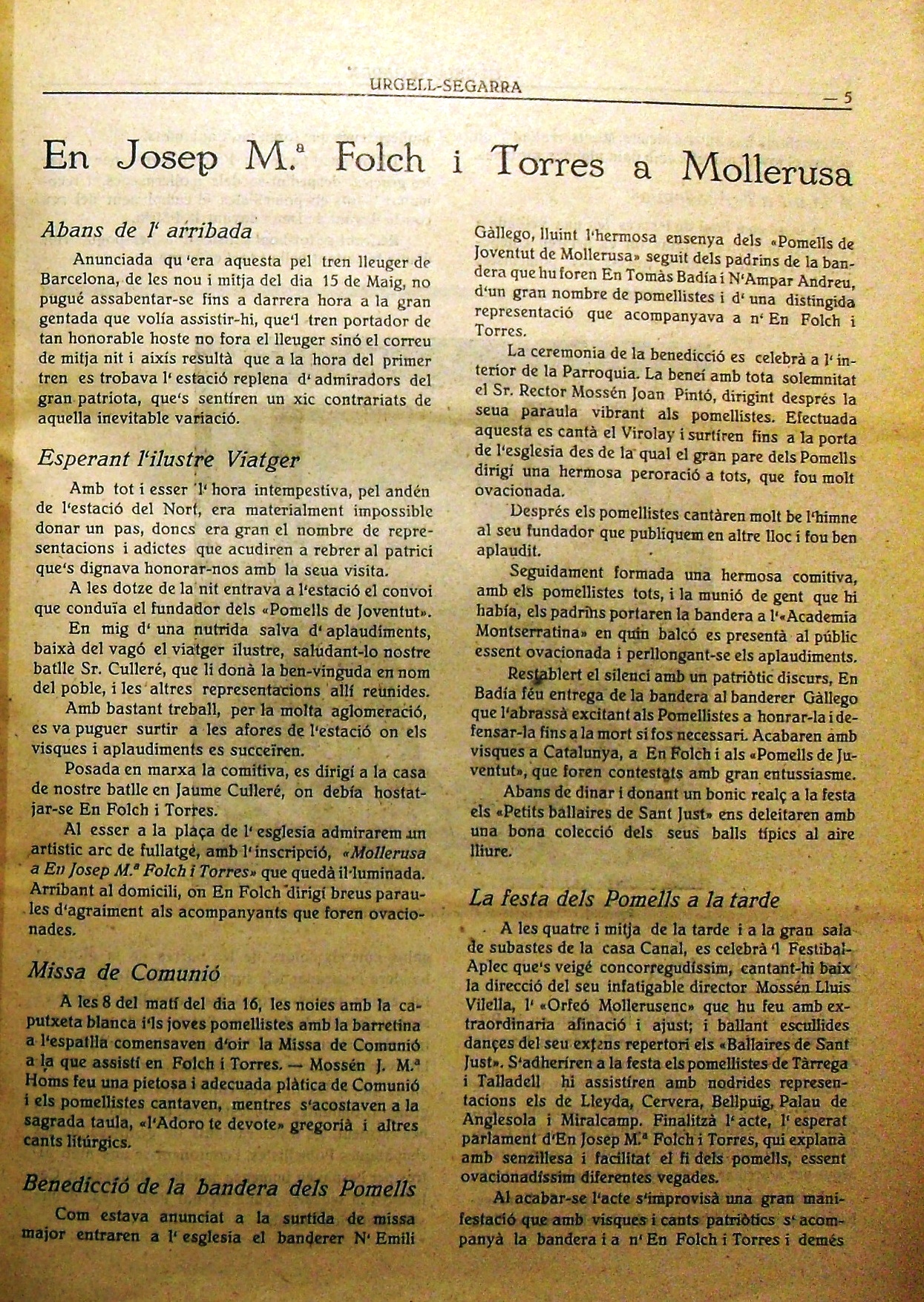 Tot seguit es va acompanyar la bandera dels pomellistes de Mollerussa i a Folch i Torres fins a “l’Acadèmia montserratina.” S’hi van llegir composició, per acabar, els discurs de l’ homenatjat Folch i Torres va donar les gràcies, acomiadant-se dels mollerussencs i recomanant als pomellistes de complir els seu deure envers Déu i Catalunya[7].