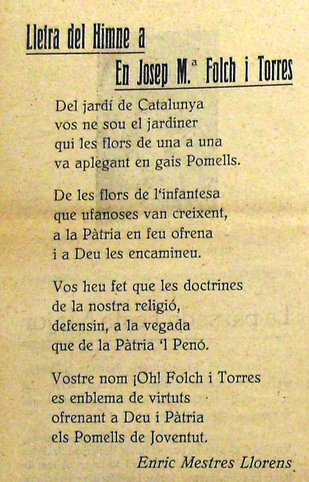 Lletra de l’himne dedicat a J. M. Folch i Torres obra d’Enric Mestres Llorens i publicat